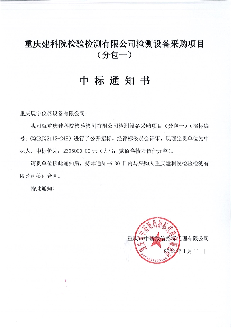重庆建科院检验检测有限公司委托重庆市中基致信招标代理有限公司对我公司检测设备采购项目(项目号:CQCBJQ2112-248 )分包一(力学)和分包二(化学)进行了公开招标采购,现已完成全部采购程序。确认重庆展宇仪器设备有限公司为分包一(力学)中标人,中标价为2305000元(贰佰参拾万伍仟佰元整)。确认重庆典鼎科技有限公司为分包二(化学)中标人,中标价为1828000元(壹佰捌拾贰万捌仟元整)。