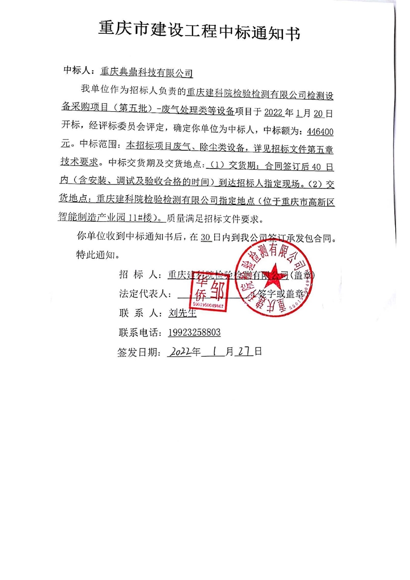 重庆建科院检验检测有限公司委托重庆市球友会手机版管理有限公司对我公司检测设备采购项目(项目号:CQEM-ZB-22002 )重庆建科院检验检测有限公司检测设备采购项目(第五批)-废气处理类等设备进行了公开招标采购,现已完成全部采购程序。确认重庆典鼎科技有限公司为检测设备采购项目(第五批)-废气处理类等设备采购项目中标人,中标价为446400元(大写:肆拾肆万陆仟肆佰元整)。