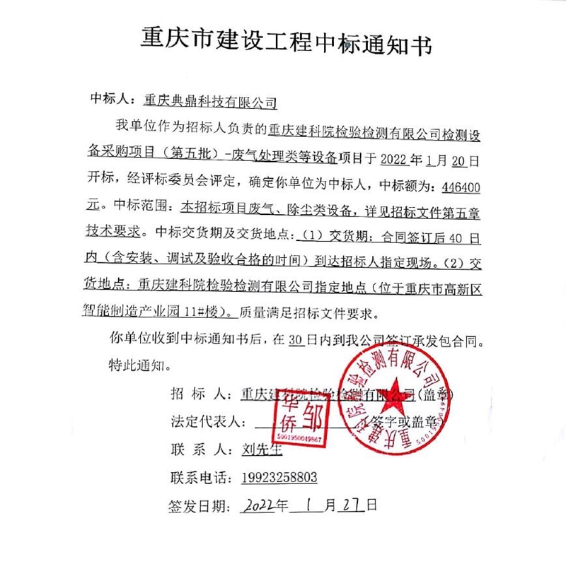 重庆建科院检验检测有限公司委托重庆市球友会手机版管理有限公司对我公司检测设备采购项目(项目号:CQEM-ZB-22002 )重庆建科院检验检测有限公司检测设备采购项目(第五批)-废气处理类等设备进行了公开招标采购,现已完成全部采购程序。确认重庆典鼎科技有限公司为检测设备采购项目(第五批)-废气处理类等设备采购项目中标人,中标价为446400元(大写:肆拾肆万陆仟肆佰元整)。
