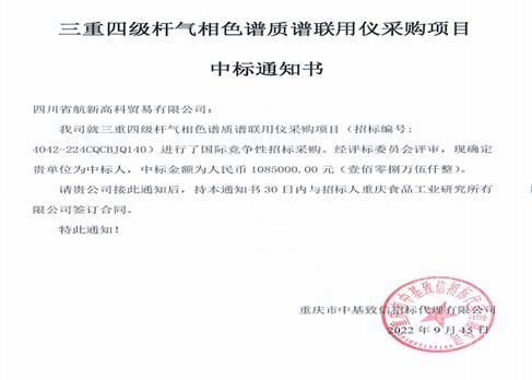 重庆食品工业研究所有限公司委托重庆市中基致信招标代理有限公司对三重四级杆气相色谱质谱联用仪采购项目(招标编号:4042-224CQCBJQ140)进行国际竞争性招标采购,现已完成全部采购程序。确定中标人四川省航新高科贸易有限公司,中标金额为人民币1085000.00元(壹佰零捌万伍仟整)。
