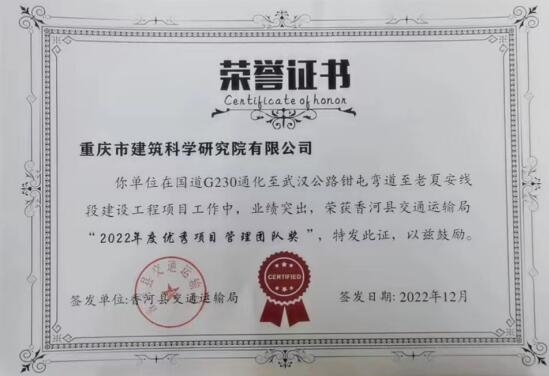 国道G230通武线项目,投资总估算约为13.36亿元,全长5.3公里,全线采用双向六车道一级公路标准建设,设计速度80公里/小时,全线设特大桥1座。2022年6月20日正式开工建设以来,市建科院始终坚持高效统筹、科学调度,在保证质量和安全的前提下,督促项目监理部切实发挥监理职能,要求总承包项目部优化施工组织,协助政府相关部门强化拆迁调度,为项目质量、安全和投资年度目标的实现打下夯实的基础,截止目前已完成投资约5.05亿元,实现安全生产“零”事故,并获得主管部门颁发的2022年度“优秀项目管理团队奖”。