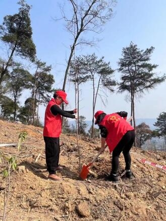 此次植树点位于缙云山歇马街道“8.21”山火发生地,2022年,重庆历经“8.21”山火考验,需通过人工造林对受灾区域进行修复。半年后,春风又绿缙云山,伴随骄阳,第一党支部全体党员同志们身穿红马甲,头戴“小红帽”,到达植树点后挥锹挖土、扶正树苗、填土夯苗、堆砌围堰、浇水灌溉......接连种下一棵棵木荷树、枫香树。现场一片繁忙景象,其乐融融、气氛热烈。