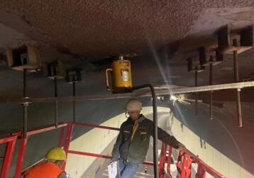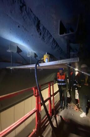 该项检测工作时间紧、任务重,检测操作难度较大。为了更好地完成检测工作,公司立即组织相关人员成立专项技术小组并召开技术论证会,随后及时安排人员开展现场检测工作,由于该隧道交通通行压力较大,检测工作选择在晚上10点后进行,并协调重庆市渝中区交警支队进行交通导行,在移动吊车、自卸式起重车等多种特种作业设备的支持下,争分夺秒,于凌晨3点顺利完成了风机吊架承载力检测工作。