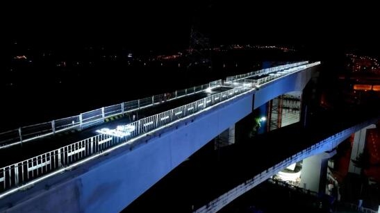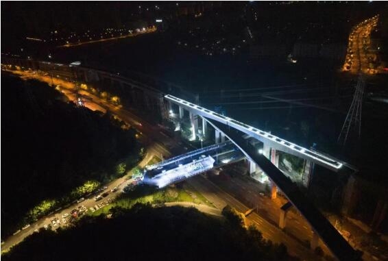 为最大程度减少对运营线路的影响,缩短建设工期,保障施工安全,项目部决定采用桥梁转体工艺进行施工,即在6号线两侧将T构连续梁浇筑完成,以桥墩为轴逆时针转体,跨越既有6号线进行对接。7月28日1时56分,6号线东延球友会手机版刘家坪站至百乐园站高架区间的两座T构连续梁转体桥开始转体施工,经过52分钟的转体作业后,实现精准对接,这既是6号线东延球友会手机版高架区间首座连续梁转体,也是重庆轨道交通领域首次实现连续梁跨越既有轨道交通线路转体,为后续类似施工提供了范本。