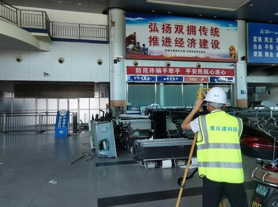 由于时间紧、任务重,为保证万州五桥机场T1航站楼改造升级后续工作顺利推进,市建科院公司接到委托后立即组织了在检测、鉴定领域具有丰富经验的专家及检测人员进驻现场进行检测。检测人员严格按照相关规范的要求,充分考虑现场检测的客观条件,编制了详尽的检测方案,于2023年8月29日开始现场检测。在所有检测人员的共同努力下,于8月31日如期完成了现场检测工作,形成的检测、鉴定报告为后续改造设计提供了依据。