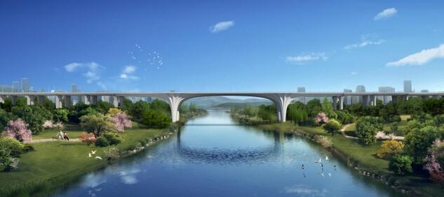 六横线御临河大桥位于重庆市两江新区龙兴工业园区内,为重庆市主城区规划“六横、七纵、一环、七联络”快速路网中六横线的关键性节点球友会手机版,也是主城区东部槽谷地带重要的东西向快速通道。该桥西起渝江路,跨越御临河,东至御复路,长约889m,设计标准为城市快速路,控制宽度39米,双向8车道。主桥为变截面连续刚构桥,桥墩采用空心薄壁墩,外挂贝壳状铝板景观结构,并与墩顶位置景观平台形成良好的景观融合。引桥下部结构采用花瓶墩,全桥以LED景观照明,外形新颖、色彩靓丽,与御临河两岸自然风光浑然一体,与周边城市景观相得益彰。