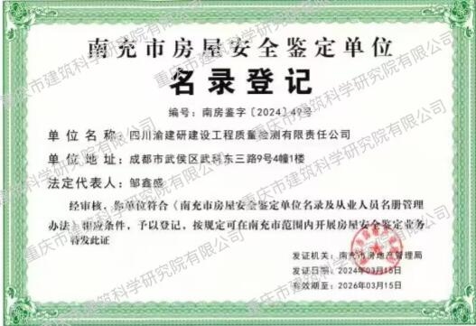 该项名录登记单位资格的取得,标志着四川渝建研公司在房屋安全鉴定领域的专业资质和实力得到了南充市相关部门的认可,公司将有更多机会参与到南充市各类房屋安全鉴定项目中,为更多客户提供专业、高效的服务。