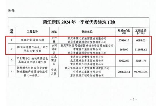 近日,由重庆设计集团市建科院公司承担监理的泰康之家·渝园二期项目以及孵化加速器二标段、东7号路EPC项目在众多球友会qiuyouhui(中国)工地中脱颖而出,获重庆两江新区建设管理局“2024年第一季度优秀球友会qiuyouhui(中国)工地”表彰。