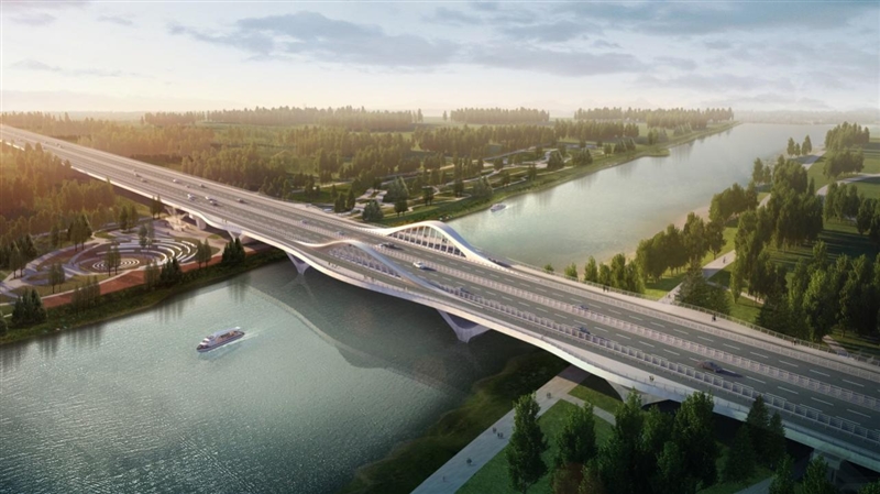 主桥设计采用梁-拱型组合体系,立意“荷香”,将荷叶形态融入到桥梁造型当中,荷叶浮于运河之上,整个造型宛如运河上盛开的荷花,生态自然,与环境融为一体,给人以生机盎然、自然和谐的美感。