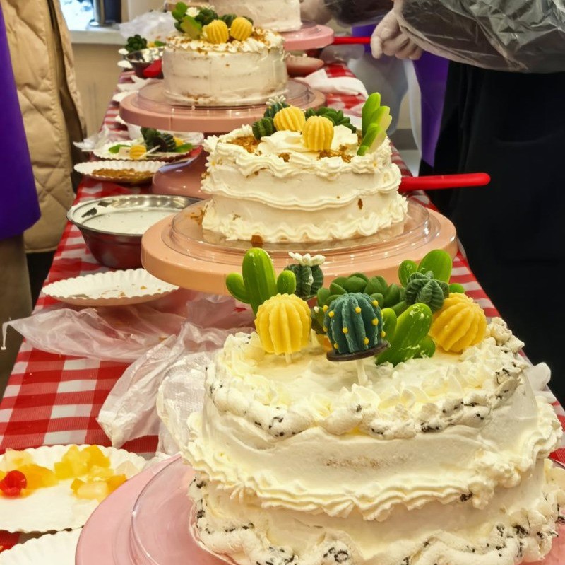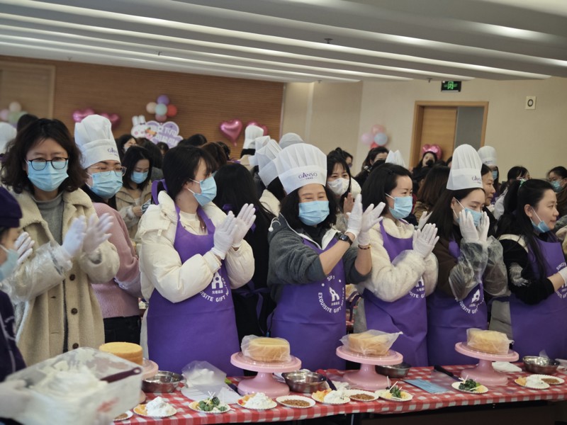 活动特邀专业烘焙师全程指导,现场宛如专业烘焙工坊,转台、抹刀等专业器具及新鲜食材一应俱全。烘焙师现场示范蛋糕制作的抹面技法,重点讲解裱花技巧、装饰布局等实操要点。女职工分组操作,通过奶油调色、裱花造型等创意实践,完成各具特色的节日蛋糕。现场此起彼伏的交流声与欢笑声中,既有裱花失误引发的趣味互动,也不乏惊艳造型收获的集体赞叹。制作完成后,女职工们携作品合影留念,并将成品封装带回家中分享。