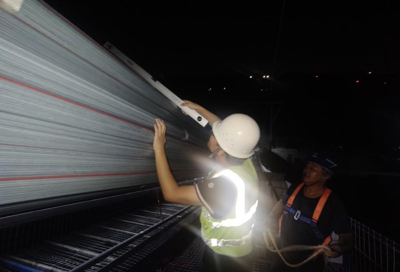 白天,建设者们在高温暴晒下反复进行索股拽拉牵引、整形入鞍,在闷热的锚室中进行锚头锚固;夜晚,建设者们在微凉的江风中测量索股线形调整,伴随着城市的余温将1.2万吨索股托举至空中主缆设计高度。