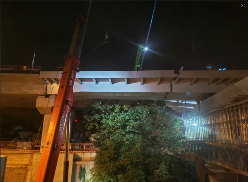 市建科院参与了其中三座悬臂挂篮施工桥梁的施工监控任务,在施工过程中检测人员与施工单位人员保持密切沟通,施工监控团队通过“设计参数识别-预测-优化”体系,结合高精仪器实时测量悬臂梁应力与偏位,与仿真模型对比分析,确保复杂地质条件下长悬臂施工安全合龙。