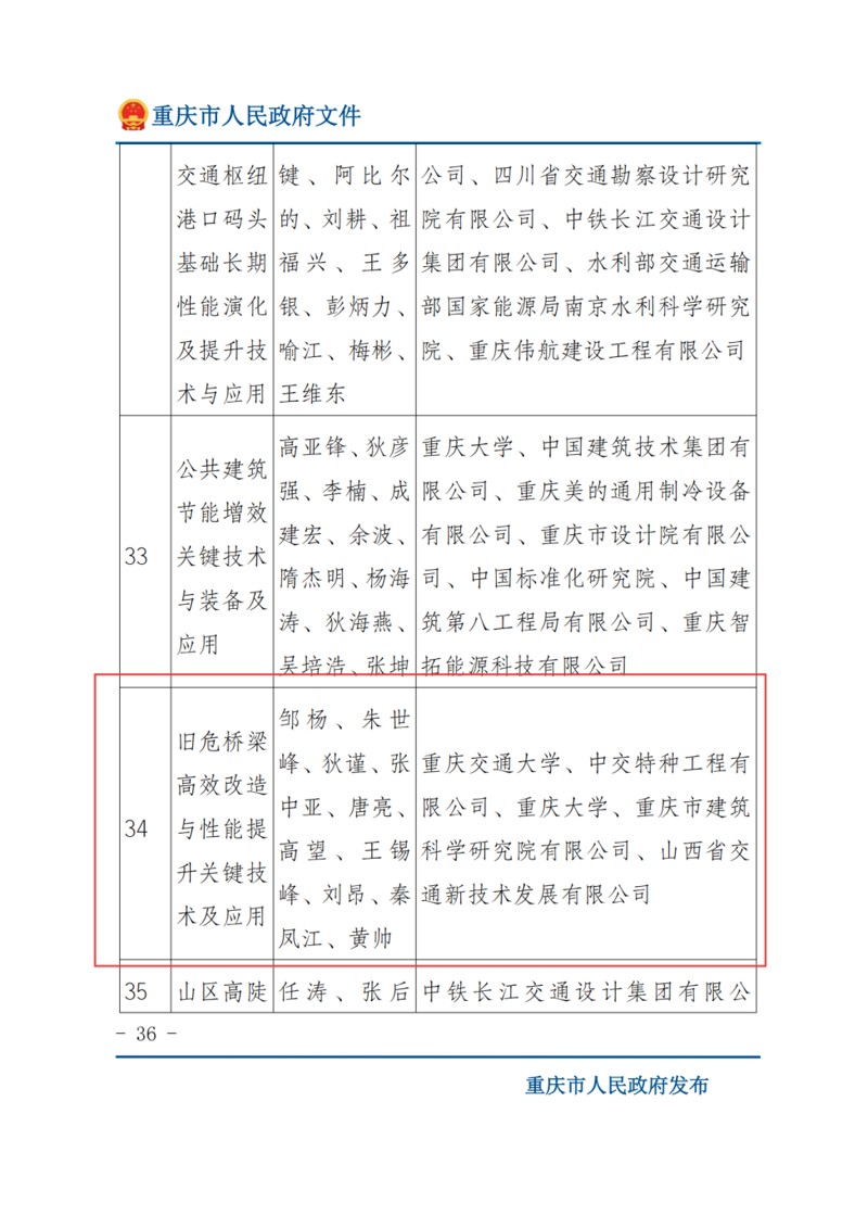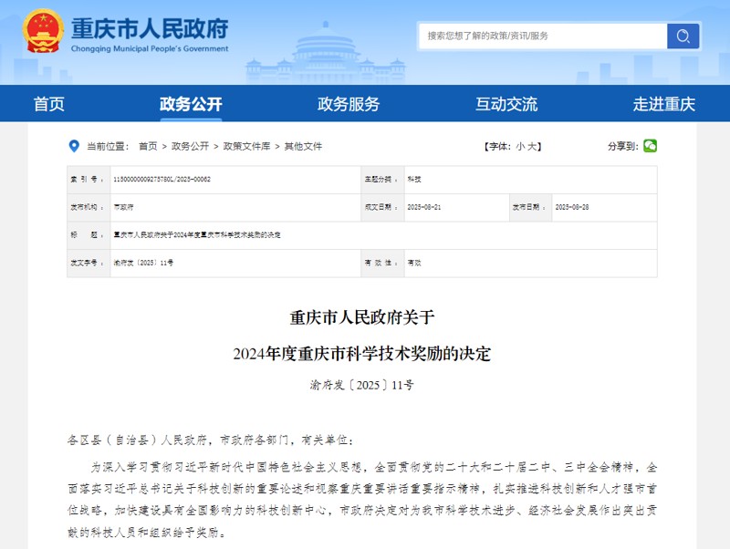 重庆市人民政府网站发布2024年度重庆市科学技术奖励的奖励决定和获奖名单