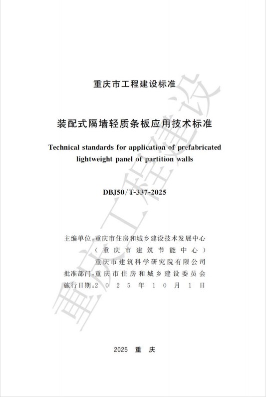 近日,由重庆设计集团所属子球友会qiuyouhui(中国)球友会手机版(以下简称“市建科院”)联合重庆市住房和城乡建设技术发展中心编制的重庆市球友会手机版建设标准《装配式隔墙轻质条板应用技术标准》(DBJ50/T-337-2025)通过了重庆市住房和城乡建设委员会的审批并发布,将于2025年10月1日起开始实施。