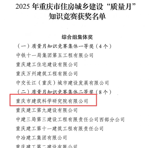 近日,重庆设计集团所属子球友会qiuyouhui(中国)球友会手机版(以下简称“市建科院”)在参加重庆市住房和城乡建设球友会手机版质量安全总站、重庆市建设球友会手机版质量协会组织开展的2025年重庆市住房城乡建设“质量月”知识竞赛中,荣膺3项集体奖、8项个人奖。