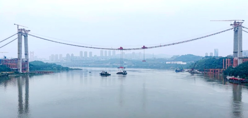 此次吊装的钢桁梁宽36.5米、长22.5米、高14米,吊重达695吨,相当于350辆轿车的总重量,是目前长江上游地区所建桥梁中单节段重量最大的钢桁梁,也是黄桷沱大桥全桥最重节段。其吊装作业风险高、技术难度巨大,施工采用了“工厂预制钢桁梁节段+现场吊装拼接”的方式,即在工厂标准化生产精度高、质量可控的钢桁梁,运至现场后利用缆载吊机直取吊装。