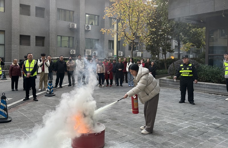 随后,参训员工在室外广场进行了消防灭火实战演练。物业管理处安保主管结合实际工作,围绕“提、拔、瞄、压”四字口诀细致讲解了灭火器的正确使用方法与注意事项。参训员工轮流上前进行灭火实操,确保人人过关,熟练掌握灭火技能、做到学以致用。