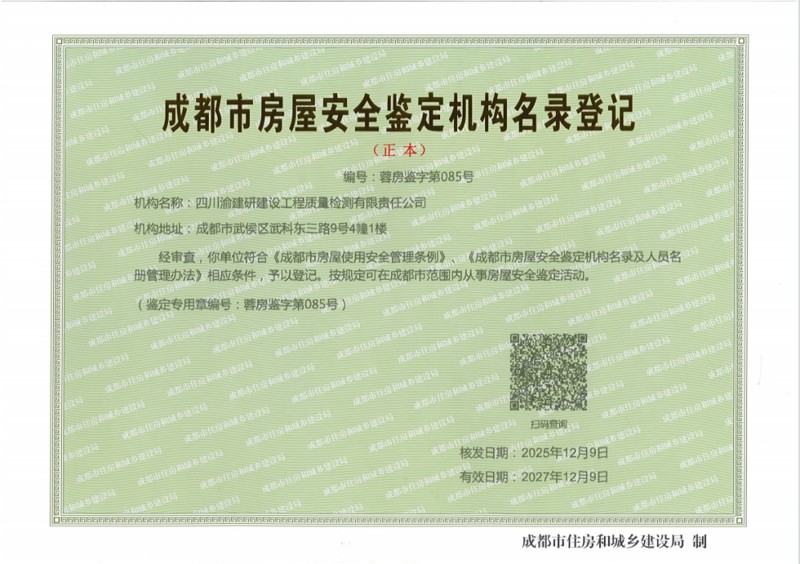 此次鉴定机构资格审查的通过,标志着四川渝建研公司在房屋安全鉴定领域的技术实力得到了成都市主管部门的肯定,公司也正式获得参与成都市各类房屋安全鉴定项目的资质许可,可面向客户提供专业、高效的鉴定服务。
