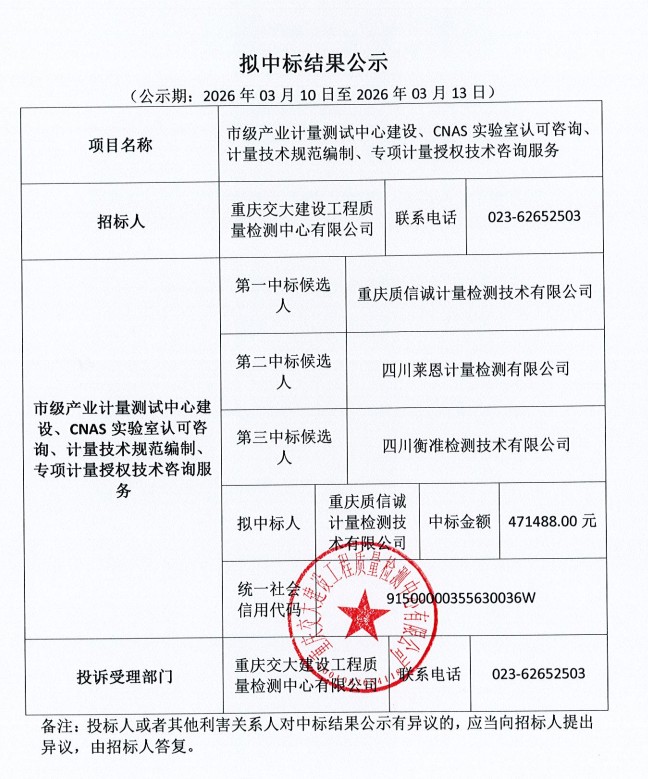 市级产业计量测试中心建设、CNAS实验室认可咨询、计量技术规范编制、专项计量授权技术咨询服务中标公告